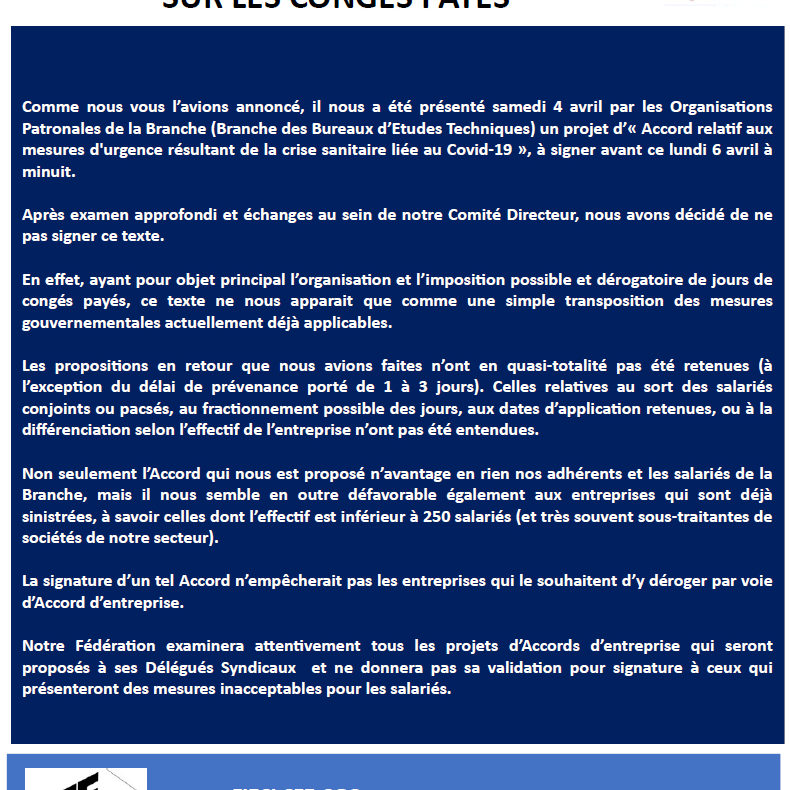 Faisant suite à notre dernière communication du lundi 6 avril concernant le projet d’« Accord relatif aux mesures d’urgence résultant de la crise sanitaire liée au Covid-19 » présenté par les Organisations Patronales de la Branche (Branche des Bureaux d’Etudes Techniques), nous vous informons que celui-ci n’a pas été adopté, étant signé au final par…